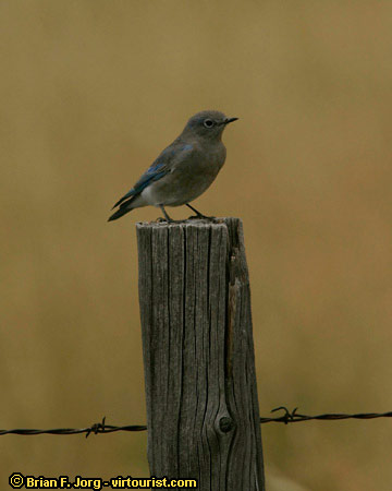 A mountain bluebird lands on a fencepost. Wildlife is abundant, and much can be seen right from the road. Coyote, antelope, and bison are plentiful.