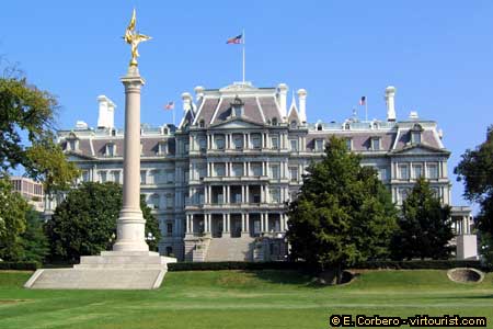 Next to the White House main facade, North side, is the Old Executive Office. The building was built at the end of the 19th century, and it is a National Historic Landmark. The Old Executive Office houses the Departments of State, War, and Navy. Guided tours are offered only on Saturday mornings.