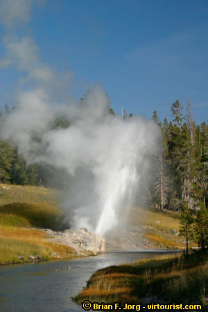 Riverside Geyser is a short walk from Old Faithful. With eruptions lasting up to 20 minutes, this geyser can be enjoyed from a number of angles. Riverside geyser can reach 75 feet, but erupts every 5 to 6 hours. This feature erupts on the shore of the Firehole River, a scenic river that runs thru this geyser basin.