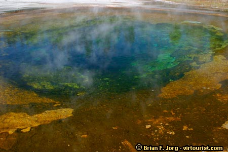 Morning Glory Pool is a hot spring, not a geyser. It does not erupt, but this colorful pool is a beautiful feature. This hot spring lies along side the boardwalk that leads from Old Faithful thru the geyser basin. Allow yourself plenty of time to visit the multiple thermal features in this area.
