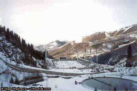 Lets go up the Dostyk avenue to the upper region of the city called Medeo. Here is the famous skating rink with artificial ice in the valley between beautiful mountains on 1691 m above the sea level. A little upper of the stadium you can see the setting pool with the crystal water which is used for the ice on the skating rink.