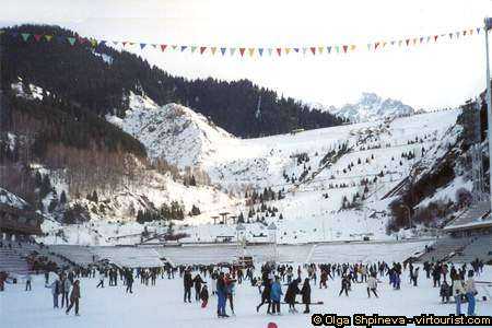 But there is a hidden danger in mountains ... Almaty survived a few nature disasters, as it situated in the seismic region. The most tragic events were happened in 1887, 1910 (earthquakes) and 1921 (mud flow) when the main part of the city was destroyed by flows mixed of mud, boulders and stones. To prevent the disasters there were built the protection constructions on the Small Almatinka and on the Big Almatinka rivers. The first seismic dam 150m height and 530 m long was built in 1966 by the pinpoint blasting above Medeo skating rink. You can see it in the photo. It blocks the Small Almatinka valley and defends the city and at the same time it's a one of the main object of interest. The water of the river streams through the body of the dam by the tubing.