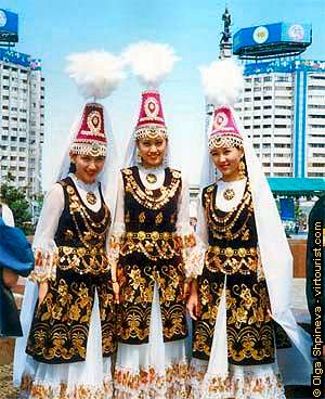 Kazakh girls from a folk group in national festive dresses. Traditionally the woman's clothes consist of a dress(from light silk or cotton) and a sleeveless jacket (from velvet). They are usually rich decorated (depending on destination) with embroidery and breading, with gold thread and pearls and even with coins. The festive dress certainly includes a beautiful high hat with plume and light cape. Though Kz are Moslems, there is no tradition for Kz women to hide their faces under paranja.