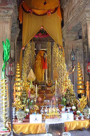 The temples of Angkor are a mix of Hindu and Buddhist. Every once in awhile you will find a little shrine that is still in use, like this one.