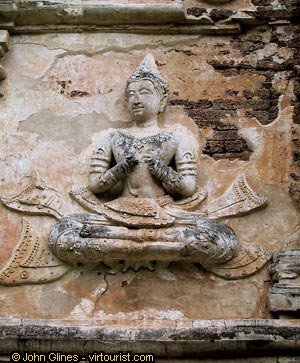 This is one of the many devatas (angels, spirits or lesser gods) carved on face of the seven spired structure of Wat Jed Yod.