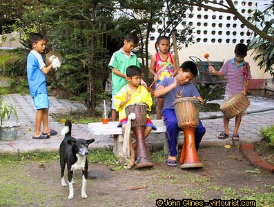 And here are a bunch of kids making music on temple grounds. I imagine the dog is their mascot.