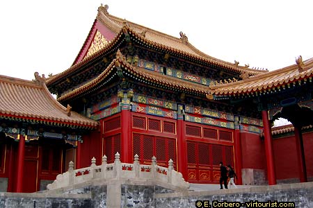 The "West Route" starts west of the square between the Inner Court and the Outer Court. The Entrance is through the "Gate of Flourishing Prosperity". This part of the Imperial City comprises six halls. The first hall is "Jun Ji Chu", for the Department of Military Affairs during the Qing Dynasty. Next you should visit the "Hall of Mental Cultivation", the bedchamber of eight Qin Emperors. Further north is the "Hall of Eternal Longevity", which hosts temporary exhibitions. West of it, is the "Hall of Supreme Ultimate". North of it, the "Hall of All Encompassing Universe", with its small theater. Further north is the "Hall of Everlasting Spring", and east of it, the "Hall of Assisting Earth". North of it, the hall of the Empress, the "Hall of Harmonious Universe". Further north , is the "Hall of Gathering Universe" and east of it, the Gate to the Imperial Garden.