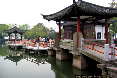 In the picture you can see part of the Zigzag Bridge on Lesser Yingzhou Isle. On this island you should not miss the Xianguang Temple, The Xianfang Platform, the Huajia Pavilion and the Yubei Pavilion.