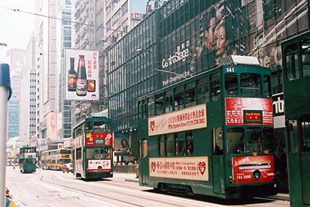 And here we are down in Central, the oldest part of Hong Kong and its central business district. Many of Hong Kong's government buildings, business skyscrapers, and fanciest hotels are in this area. As you can see from the English-style double-decker buses, at least some British touches remain here.
