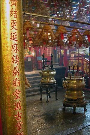 Among the things you see inside the temple are giant incense coils hanging from the ceiling, which give the place a smoky, fragrant ambience. There are also lots of little sticks of incense, statues of deities, worshipers praying, etc.