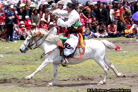 After the parade, the horse skill competition starts. Tibetans with their traditional clothes ride local horses, and show off their riding skills.