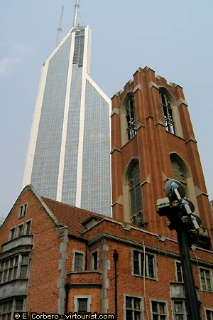 In the picture you can see the mixture of styles in the center of Shanghai. In the background you can see one of the financial skyscrapers in the city center. In the foreground you can see the Moore Memorial Church. The original church was built in1929, but a couple of years later the Hungarian architect Ladislaus Hudecin rebuilt this landmark in People's Square.
