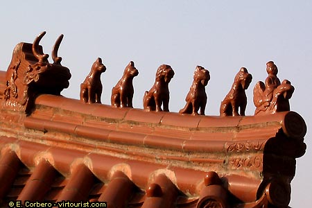 Many temples and ancient buildings in China have animals on their roofs. My local guide told me that the more important the building, the more animals you see. I think the ones that have the most animals in China are the roofs in the Forbidden City, in Beijing. In the picture you see five animals, this indicates this is a rather important building.