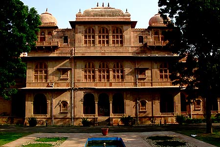 In Bikaner you can visit several palaces. On this virtual tour, I will show you a couple of them. The first is the Lallgarh Palace, a spectacular building (inside and outside). As you can see, its facade is richly decorated with carved stones.