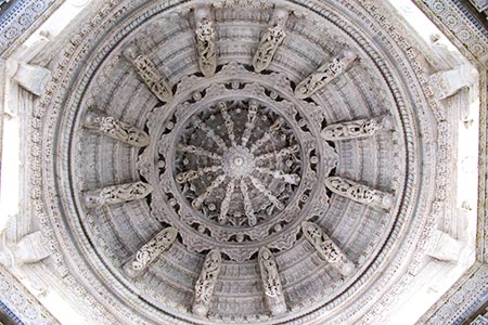 The Ranakpur Jain Temple was built in the 15th century by the monarch Rana Kumbha. The temple has 24 pillared halls. The central hall is decorated with a beautiful dome, in the picture.