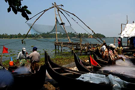 The fishing nets are held horizontally, and lowered into the waters with a basic mechanism. The strong currents of the area carry a lot of fish.
