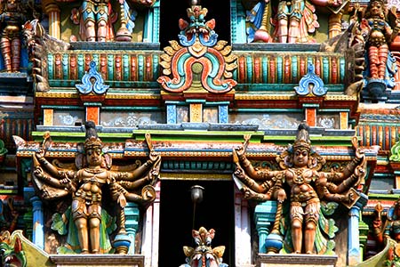 Here you can see a detail of one of the Temple's Gopurams, with its stucco painted sculptures.