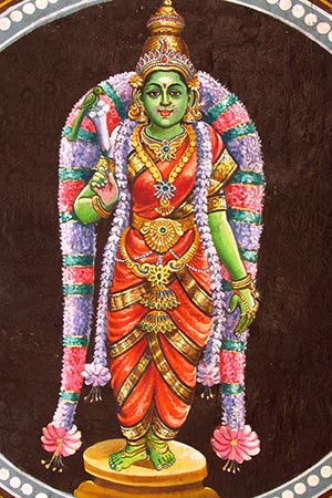 Next to the Chitra Gopura is the Golden Lotus Tank, or Potramaraikulam, where devotees take holy baths. The tank is surrounded by a corridor with paintings on the ceiling. You can see one of the paintings in the picture.