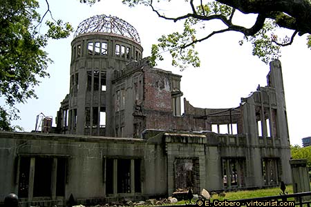 In this picture you can see the A-Bomb Dome. This building used to house the Prefecture Industrial Promotional Hall. It is said that the A-Bomb exploded just above it. Within a radius of two kilometers from here almost all buildings were destroyed. The building has been preserved as it was after the bomb. Now it is a symbol of the destructive power of nuclear weapons.