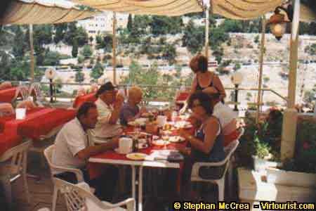 Sure, it's hot out but it's a dry heat. I've selected a restaurant with red canvas to shield us from the summer sun. It's August, so the sun is strong. The vegetarian dish is delightful and I recommend the green salad and the hummus on pita bread.