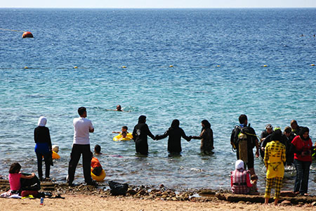 In the picture you see women from the region going for a swim on a public beach. As you can see local people have a different dressing code for swimming.