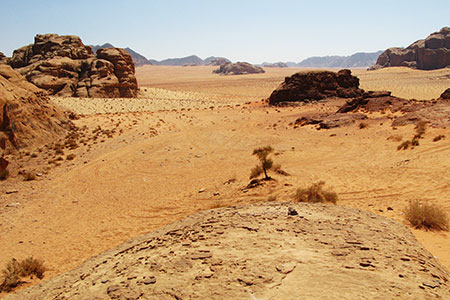 In this picture you can see a view of the desert from a rock. As you can see there is not much vegetation in Wadi Rum. There is actually only three species of trees: the Acacias, the False Figs and the Tamarisks. Most of the vegetation consists of small bushes. They are the main source of food for the Bedouins' goats and camels.