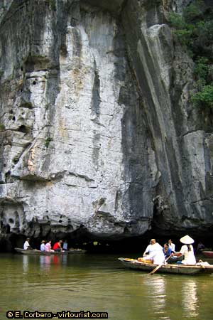 Here you can see why the area is known as Tam Coc (Three Caves). During your skiff trip, you will pass by three spectacular caves. Caves vary in height, but none is more than two yards high. Most of the times you have to crouch. Big stalagmites hang from the cave's ceiling.