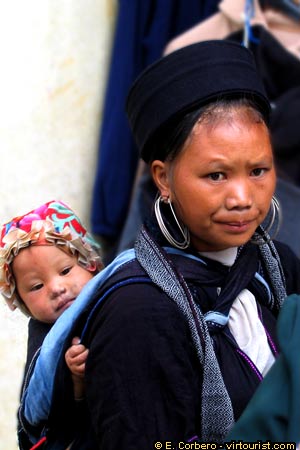 The Hmong minority is divided in several subgroups. It is very easy to identify them, looking at the color of the clothes they wear. In the picture you can see a mother with her child. She belongs to the Black Hmong tribe.