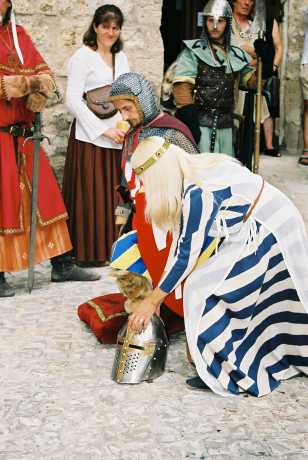 After the Mass, the Lord of the Castle confers knighthood on a young candidate. The young knight is supposed to have spent the night fasting and praying. He will now be given his coat of mail and his helmet, and pledge allegiance to his lord.