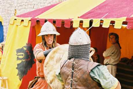 In the meantime, the Lord's army has set up camp outside the city walls, where soldiers practice their swordfighting skills.