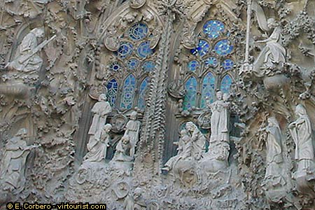 This is a detailed view of the "Sagrada Família"'s older side: the Naixament Facade. This Cathedral was designed by Antoni Gaudi. It was begun in 1884, it is still being built, and it will not be finished until the 22nd century. Although modern techniques are currently being used, some parts of the construction can only be completed using the old traditional ones. Another reason why the construction is taking so long is more materialistic: money. All funds come from donations.