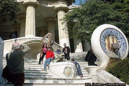 We are at the "Parc Güell"'s main entrance. You can see the Dragon sculpture (well, in fact, I'm not sure if it is a dragon or a lizard). The dragon is a typical Catalan symbol. Do you know the Saint George Legend (Sant Jordi)? The Saint killed the dragon, which threatened the community. He finally married the princess. And now Sant Jordi's day is celebrated as the lovers day (April 23rd). Women give books to their lovers, and men a rose to their lady.