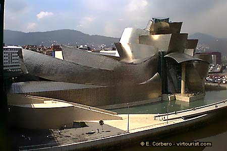 This is probably the nicest view of the Guggenheim building. You can see the Museum reflected on the "Ria Ibaizabal" and Bilbao's old quarter in the background.