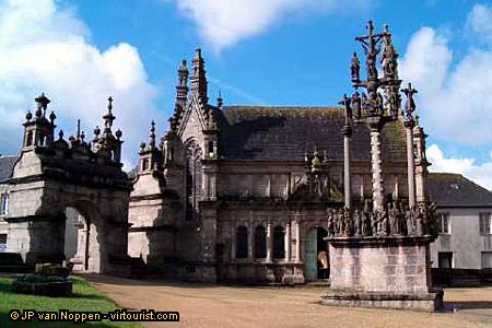 This picture shows some characteristic monuments of a Breton church close. From left to right, The Monumental Arch, which constitutes the main gate to the enclosure, the Ossuary, and the Calvary, here composed of a footing decorated with sculptured figures, and three crosses.