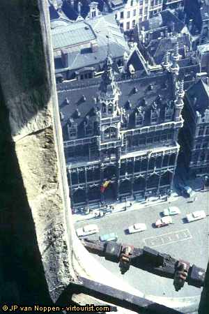 This picture was taken in the sixties, when the tower was still accessible to the public. It offers a view of the marketplace, which at the time was still open to traffic. There usually is a flower market in the morning, a bird market on Sundays, and plenty of opportunity to sample the famous Belgian beers in the many cafés. Once a year, the place is covered by a flower carpet made with begonia petals from Lochristi in Flanders. At other times, the Square is the scene of the Ommegang, a colourful pageant (originally a religious procession) re-enacting the festival held in 1549 for Emperor Charles V and his family.