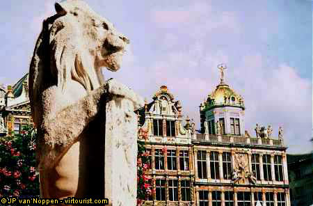 The Town Hall Square is surrounded by the houses of the various Corporations, Guilds and Trades, many of them with gilt decorations on their façades. The lion in the foreground guards the staircase to the town hall, which leads to its richly decorated wedding hall. Newlyweds like to have their picture taken here.