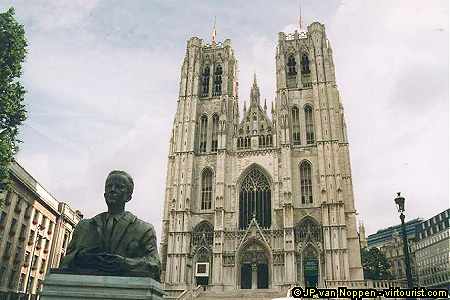 The Gothic cathedral of Saint Michael is known to Brusselers as Sainte-Gudule (an apocryphal saint). In front, a statue of the late king Baudouin, who was loved as a symbol of national unity in a country divided by ethnic and linguistic strife between Flemings and Walloons.