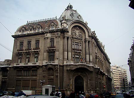 Here the esteemed viewer (YOU!) can admire the National Library of Romania. In old times it used to be the Stock Exchange but as the Communists came, they considered obsolete having a stock exchange in a centralized economy therefore they made yet another Library. In 1989 the authorities began construction for another National Library (most likely in their lunacy planning to wipe out this one) but the revolution came and their plans came to an end. Now the government has resumed construction at the grandiose site of the 140 thousand sqm National Library which apart from the Library itself will also be the headquarters for the Government. It remains to be seen whether they'll give this building back to its destined use or will they do something else with it. As far as architecture goes, it's French Eclectic, it was finished in 1910 after a design by Stefan Burcus. It's right in the middle of the financial of which 2 parts will be revealed to you in the next 2 slides.