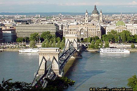 From the Castle District theres a nice view of the other river bank, where Pest sits. You can see here the most famous bridge in town: the Chain Bridge. This was the first bridge over the Danube, constructed between 1839 and 1849. The bridge is also known as the Széchenyi bridge (after the Count István Széchenyi). This bridge was destroyed during World War II, and re-opened in 1949.