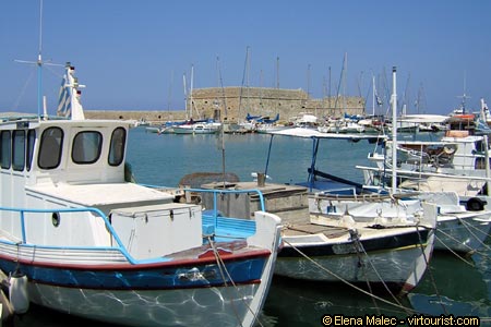 We begin our exploration of Crete in Heraklion or Iraklio, the capital of the island since 1971. Built as a seaport by the Arabs the city was later reinforced as a fort by the Venetians who called it Candia. The fame of the city as a centre of arts and culture under the Venetian rulers gave its name to the island that in the medieval times was known as Candia. The Venetian Walls of Iraklio with a length of 4 kilometers and seven ramparts still standing today are the most important Venetian fortifications in Greece. The Walls end in the Rocca al Mare, pictured here, the Venetian fortress built for the protection of the breakwater. The Ottoman Turks called this fortress Koules and used it as a prison, adding the upper parts and a minaret.