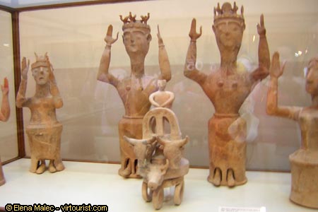 Figures of the goddesses with upraised hands, and a rython in the shape of a bull-drawn chariot from Karphi 12-11th c. BC.
