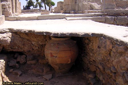 The low strata of this imposing architectural complex is occupied by the granaries of the old Palace or the storerooms. Here is an old storage jar (pithoi) from the proptopalatial period. The pithoi found in the old Palace storage room were used for storing oil, wine, and wheat and a look at the Mesara plain from the site of the Phaistos Palace gives one an insight of the fertility of the place. The city and Minoan Palace is at an elevation of 100 meters above the sea level.