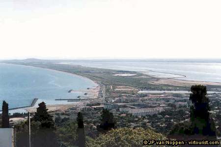 The Bassin de Thau stretches from Mont Saint Clair, near the town of Sète, to the Cap d'Agde (the hill visible at the horizon). Between these two extremities, a narrow sand bar offers 20 km of sparkling beaches. The rest of it is occupied by a road, a railroad track, vineyards, saltworks and several tourist facilities (campsites, hotels, restaurants, supermarkets etc.).
