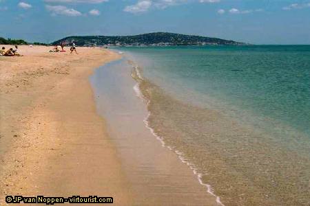 On busy days in the tourist season, the beaches near the towns can be pretty crowded. But since parking facilities along the 15 or so km of road are limited, there is always plenty of space left for bathers. This picture shows Mont Saint Clair, with part of the town of Sète hugging its base. Its silhouette is a familiar sight and a landmark for whoever travels on or around the Bassin de Thau.