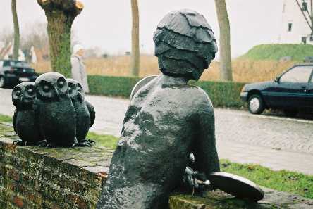 Damme is the home not only of 13th century author Jacob Van Maerlant, but also of Thyl Ulenspiegel, the popular wag who, at the time of the Counter-Reformation, played practical jokes on the Spanish occupants. Ulenspiegel means "Owl's Mirror", and Thyl is here shown holding up a mirror to three owls. The character appears in Flemish, Belgian-French and German literature.