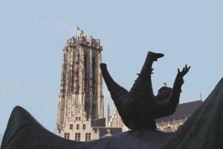 Mechelen or Malines is a small town between Leuven and Antwerp, and home to the Brussels-Malines archbishopric. The high but squat tower of its Cathedral, Saint Rombouts, can be seen over a very large distance (even from Brussels, on a clear day) and has therefore become a landmark -- literally. The monument in the foreground represents Opsinjoorke, a character in the local folklore (not unlike the Spanish Pelele painted by Goya) who is tossed into the air on a blanket as a punishment for his rowdy life, heavy drinking and unfaithfulness to his wife.