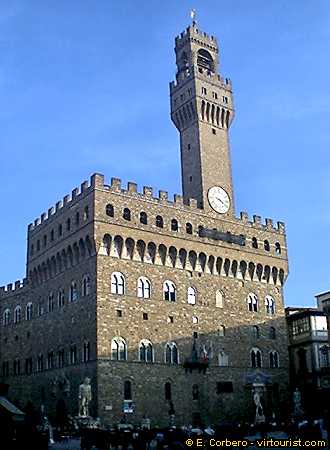 The 'Palazzo Vecchio' is located in the 'Piazza della Signoria'. It was constructed in 1294 (A. di Cambio) and later expanded by Buontalenti and Vasari. It was designed as a Fortress-Palace to be used as the 'Signoria' headquarters. The elected members of the Republic of Florence formed the 'Signoria'. In 1540 The Medici Family moved to this palace, they stayed here for ten years, later they moved to the 'Palazzo Pitti'. Then they called this Palace the old Palace (= 'Palazzo Vecchio').