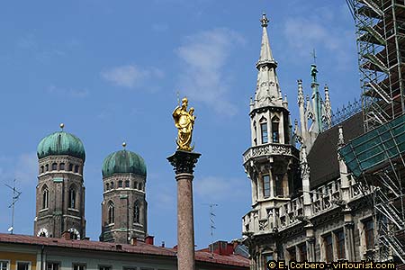 In the middle of Marienplatz is the Mariensäule (or Mary's column), a golden statue built in honor of the Virgin Mary.