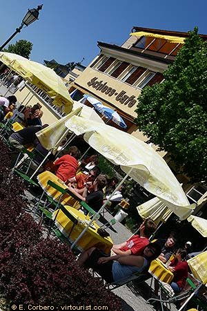 Here you have a picture of the terrace of Schloss Cafe, where you can have a beer while enjoying the views of the Tegernsee lake.