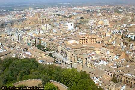 We are now on the top of the Alcazaba Fortress, from where we can see a spectacular landscape view of the city. On the left you can see the Cathedral.